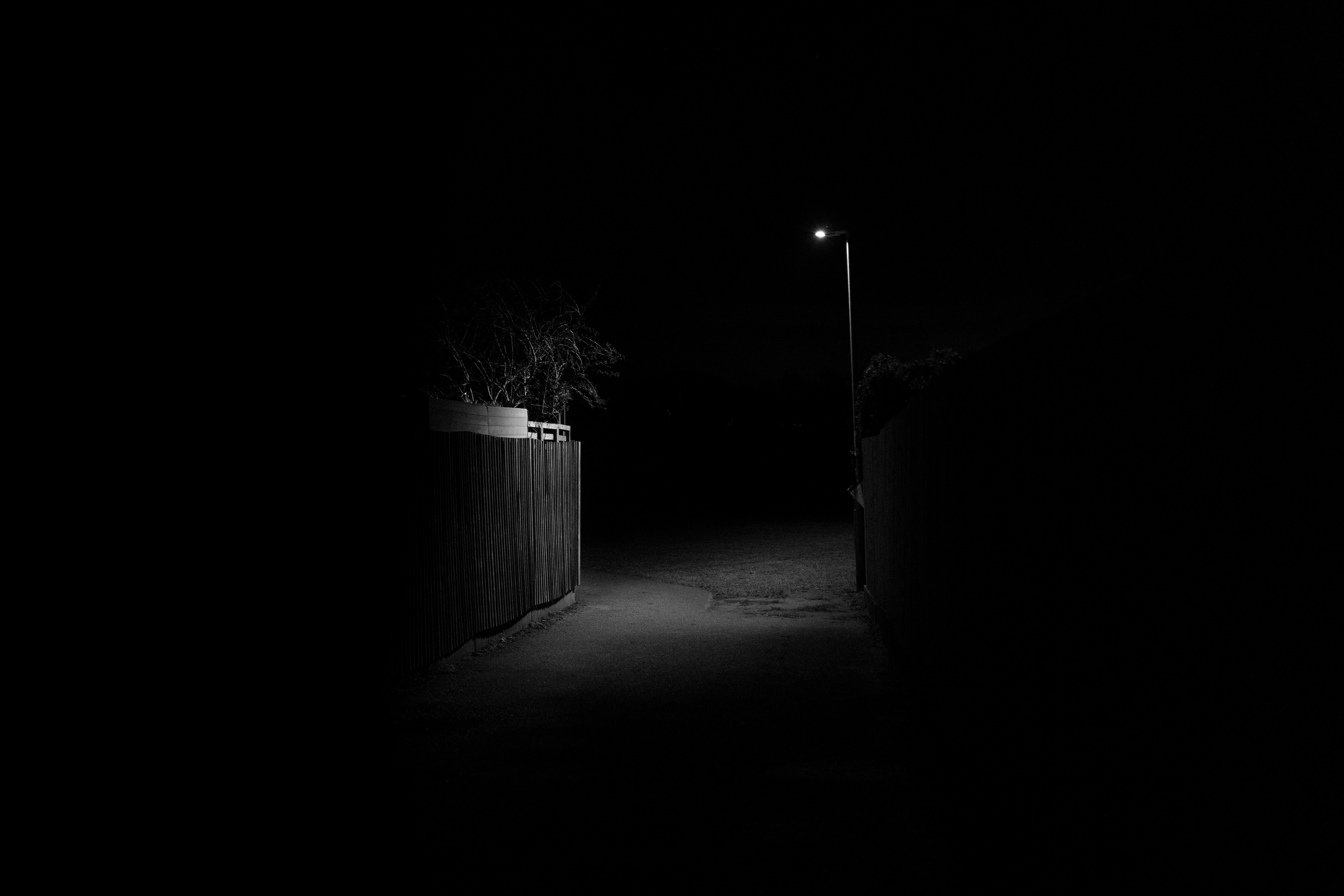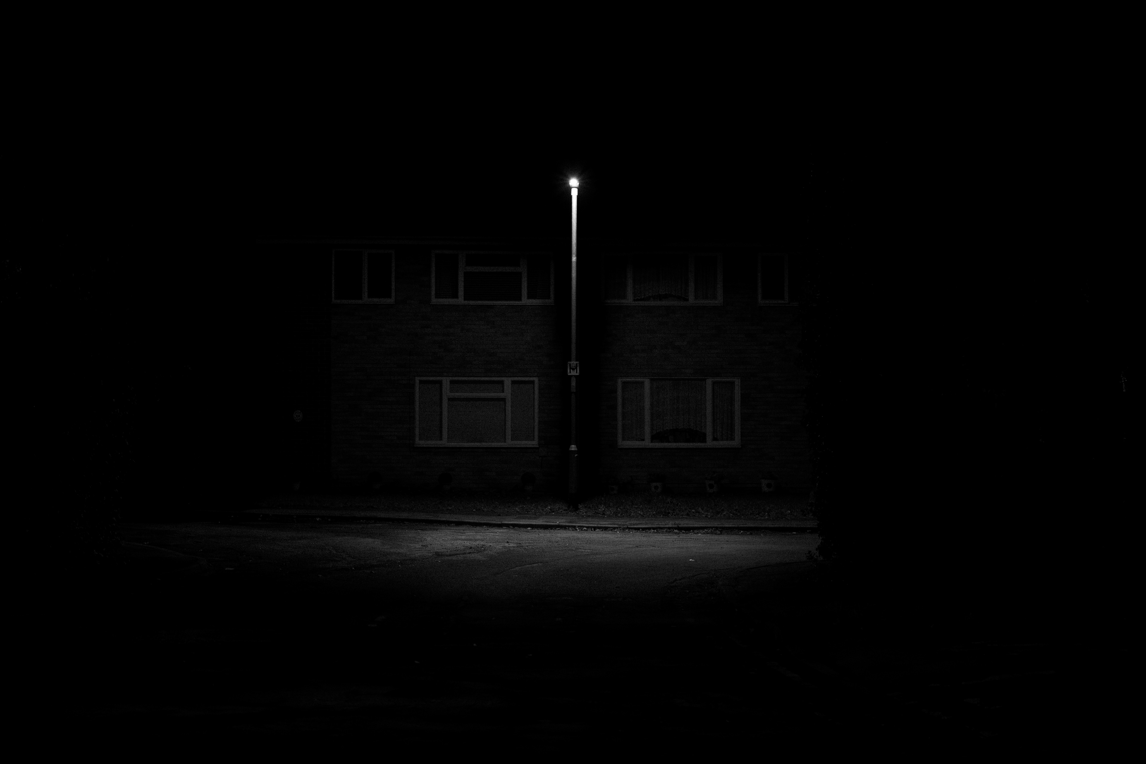 These photographs are made at night, when the routines of work and transit fall away and the town is left to itself. Street lamps, houses, vacant streets and uneasy sightlines become the dominant features.
